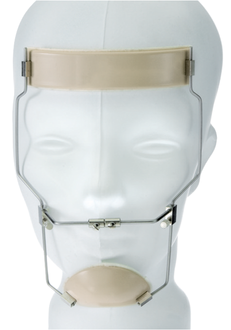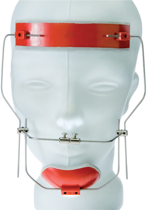 Comfortable anchorage for protraction: the stainless steel frame is softened by hypo-allergenic chin and forehead pads to reduce irritation.